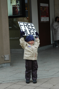 そんな中、ただ「FREEHUGS」のプラを掲げて立っているだけなのに、かっこよく真っ直ぐハグして去っていった若者がおりました。思わず、かっこいい~~♪