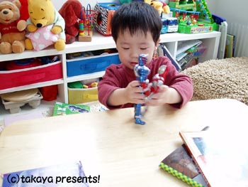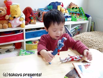 「じゃ、仮面ライダーとパパとどっちが強いの?」と聞くと「パパ」と答えたので?パパは強いところを見せようと、仮面ライダー響鬼と戦ったら、響鬼の角がパパの手のひらに刺さってしまい血が出てしまった。穴が開いたよ!? 仮面ライダーの人形は塩ビではなくちょっと固めのプラスチックかな?とにかく硬い。しかも頭に角がついていて、これが危ないということが証明された!!