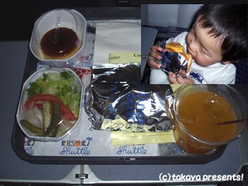 大人の機内食はクラブサンドとチョコレートケーキ。こちらもまずまず美味しかった。お腹がすいていたため、写真を撮るのも忘れて食べてしまった(^^;