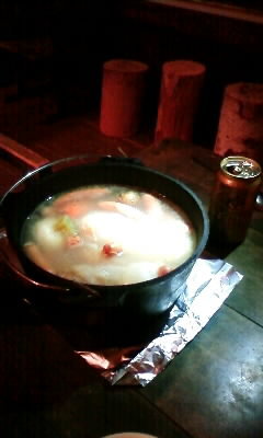 火にかけて、煮立ってきたらダッチオーブンのふたに炭を置いて、そのまま近場の温泉へ。