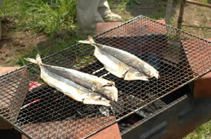 畑から戻って、園庭で火を起こしてクサヤ焼きです~~。初めて匂いをかいだけど、まるで牛舎。バキュウムカーの懐かしい匂い(爆)こんなに臭いんだ~~。これを口にしてみようなんて、最初に食べた人はよっぽど飢えていたんだろうね(^^;