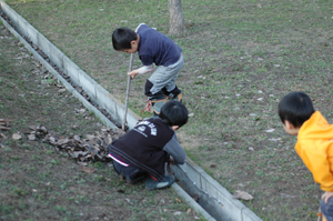 雪解けもかなり進んでいて、今年も園舎の前には小川ができてました。